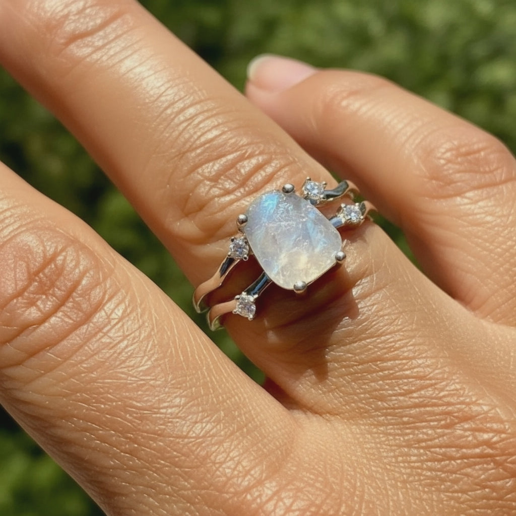 The Moonstone & Silver Ring is a Talisman of Lunar Intuition & New Beginnings. A luminous Moonstone is elevated in a protective claw setting—channeling moonlit calm, inner guidance, and graceful transformation.